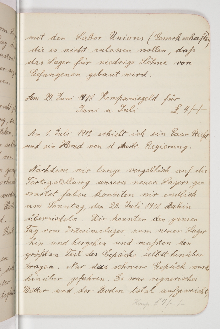 <p>[Page 120]</p><p>with the Labor Unions (trade unions], which won't allow that the camp be built by lowly paid prisoners.</p><p>Company money of £4 for June and July on the 29th of June, 1918.</p><p>On 1st of July, 1918, I received a pair of boots and a shirt from the Aust. government.</p><p>Having waited in vain for the longest time to see the new camp built, we were finally able to relocate on Sunday, 28th July 1918. We were allowed to go back and forth all day between the interim camp and the new one and had to move most of our belongings ourselves. Only the heavy luggage was transported by car. The weather was rather wet and the soil soggy,</p><p>[Note in Margin] comp. £4</p>