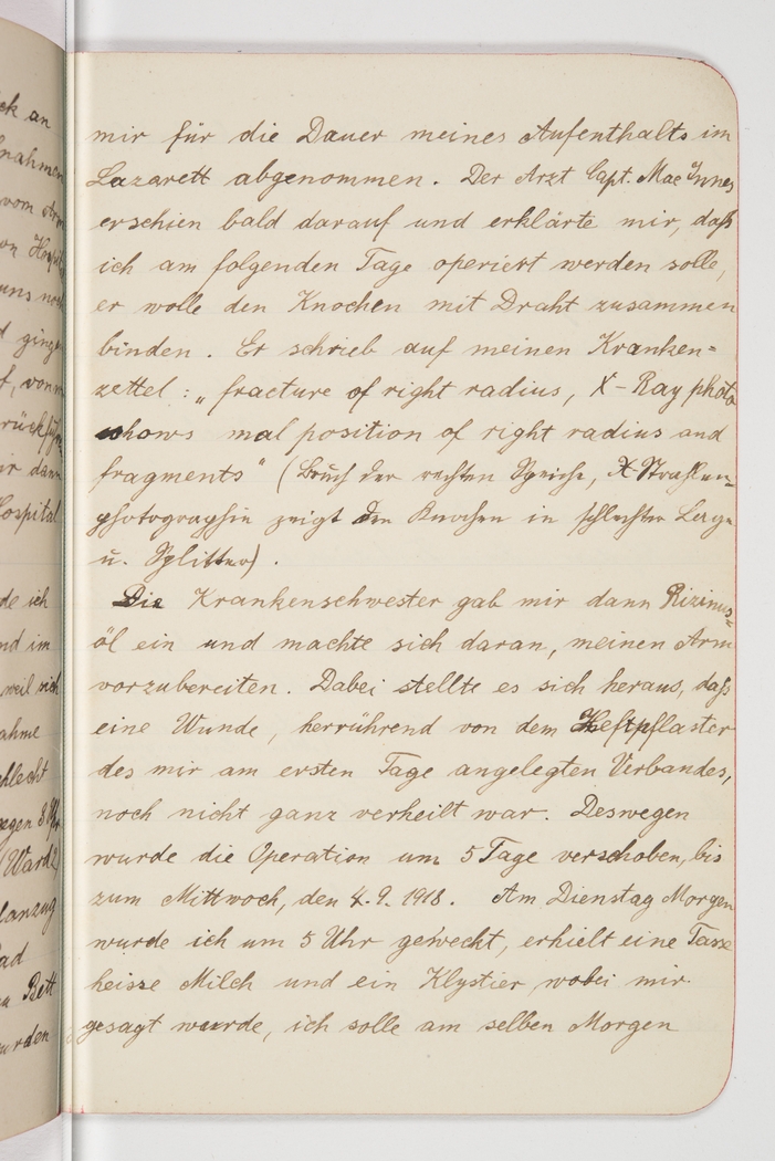 <p>[Page 126]</p><p>were taken off me for the duration of my hospital stay. The physician, Captain MacInnes, soon came by and informed me that I was to be operated on the next day, as he wanted to secure the bone with wire. He noted on my patient record: [English quote] "Fracture of right radius, X-ray photo shows malposition of right radius and fragments" [note in parenthesis is in a very different, older-style handwriting, translating the English quote back into German] The nurse had me take some castor oil and began to prepare my arm. It became evident that an abscess, the one caused by the band-aid on the very first day, had not healed properly. Hence surgery was postponed by 5 days, to Wednesday, 4th/9/1918. On Tuesday morning I was woken at 5 o'clock, was given a cup of hot milk and an enema and was told that I would be operated on</p>