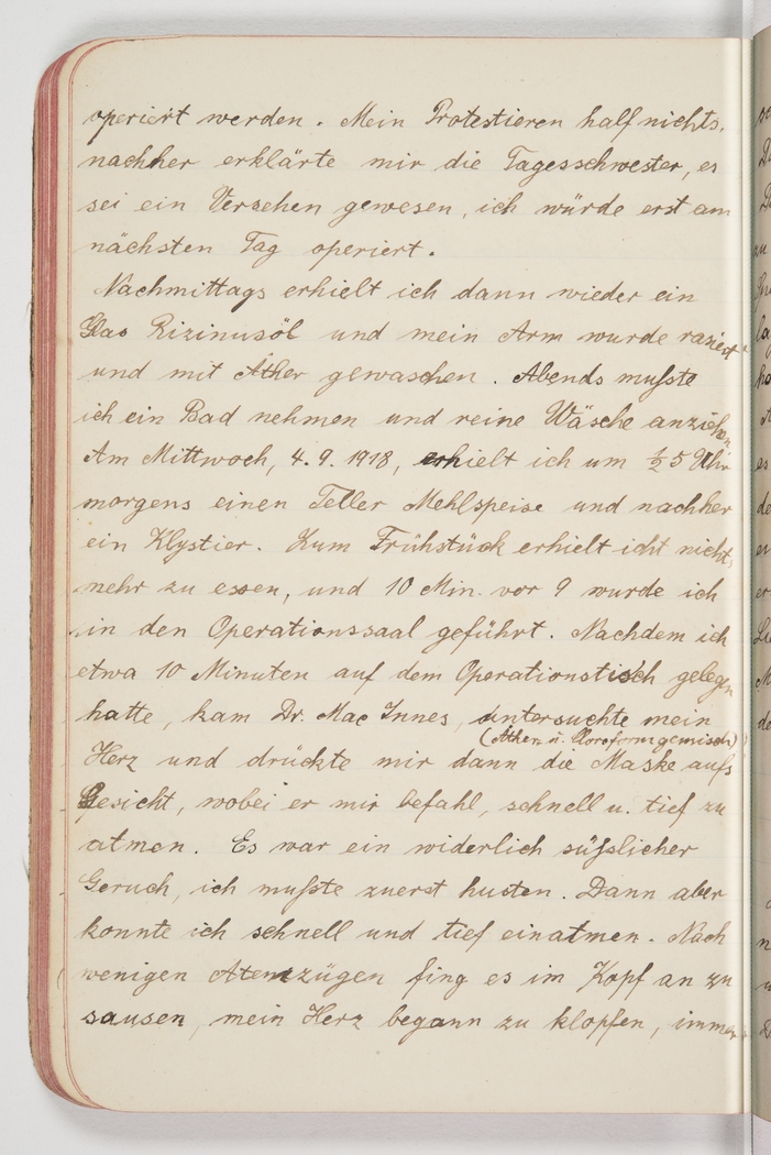 <p>[Page 127]</p><p>that same morning. My protest went unheeded, but afterwards the day nurse told me that there had been a misunderstanding and that I was indeed to be operated on the following day. In the afternoon I was given again a glass of castor oil and my arm was shaved and washed with ether. In the evening I was told to have a bath and put on clean underwear. On Wednesday, 4th/9/1918, at 4.30am I was given a bowl of porridge and afterwards an enema. I received no further breakfast and at 10 minutes to 9am I was brought into the operating theatre. After about 10 minute's wait on the operating table, Dr MacInnes came in, checked my heart and then put the [anaesthesia] mask (a mix of ether and chloroform) on my face, telling me to breathe fast and deep. The smell was so repulsively sweet I began coughing. But then I managed to breathe fast and deep. After a few inhalations my head began to rush, my heart started palpitating</p>