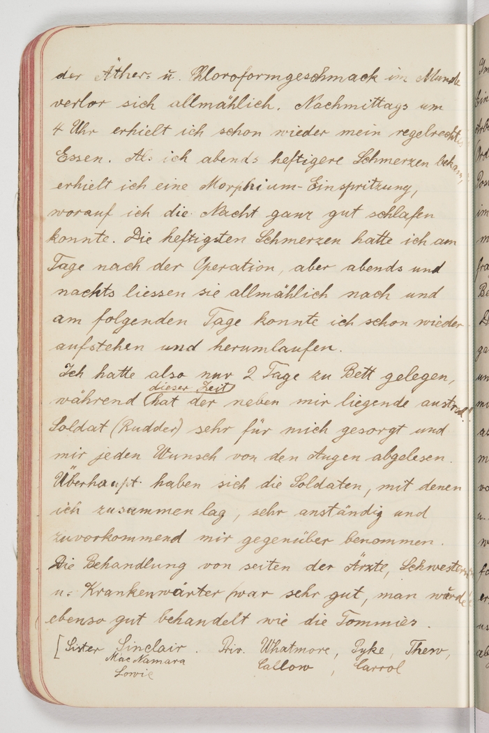<p>[Page 129]</p><p>the taste of ether and chloroform in my mouth slowly dissipated. At 4pm I already received a proper meal. When I began to feel more pain in the evening, I was given a morphine injection and slept pretty much right through. The pain was strongest on the day after the operation, but in the evening they began to let up and on the following day I was already up and about again. Thus I was bedridden for just 2 days, and the Australian soldier next to me (Rudder) really looked after me during that time, anticipating my every need. In general, the soldiers who shared my ward were very decent and courteous towards me. The treatment by the doctors, nurses and orderlies was very good, one was treated just as well as the Tommies. (Sister[s] Sinclair, MacNamara, Lowie; privates Whatmore, Pyke, Thew, Callow, Carrol)</p>