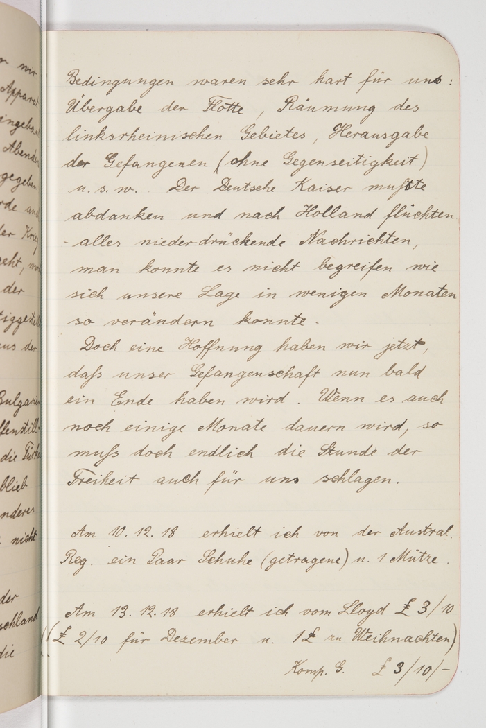 <p>[Page 134]</p><p>the conditions were brutal for us: surrendering the fleet, vacating the territories left of the Rhine, releasing the prisoners (unilaterally), etc. The German emperor had to abdicate and fled to Holland all very depressing news, we could hardly fathom how our situation had deteriorated so badly in just a few months. But at least there is hope now that our captivity will soon end. It may yet take a few months but the moment of freedom is bound to arrive for us too. On 10th/12/18 I was issued a pair of (used) shoes and 1 cap by the Aust. govt.</p><p>On 13th/12/18 I received £3/10 from Lloyd ( £2/10 for December and £1 for Christmas).</p><p>[Note in Margin] Komp. G. £3/10/- </p>