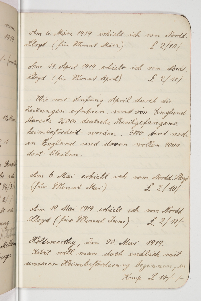 <p>[Page 142]</p><p>On March 6, 1919 I received £2/10/- from Nordd. Lloyd (for the month of March)</p><p>On April 14, 1919 I received £2/10/- from Nordd. Lloyd (for the month of April)</p><p>As we learned from the newspapers in early April, England has already repatriated 26,000 German civilian prisoners. 5000 are still in England, 4000 of which want to remain there.</p><p>On 6th of May I received £2/10/- from Nordd. Lloyd (for the month of May)</p><p>On May 19, 1919, I received £2/10/- from Nordd. Lloyd (for the month of June)</p><p>Holdsworthy, 20th of May, 1919.<br />They finally intend to begin repatriating us, and</p><p>[Note in Margin] comp. £10/-/-</p>
