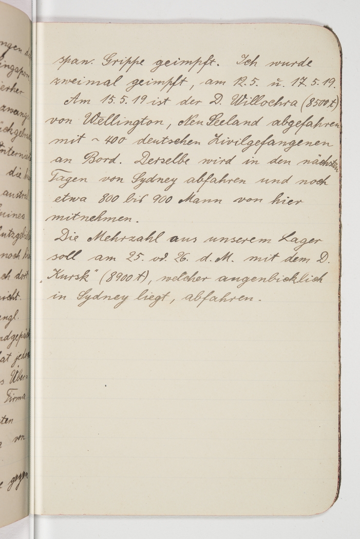 <p>[Page 144]</p><p>the Spanish influenza. I was vaccinated twice, on 12th/5 and 17th/5/19.</p><p>On 15th/5/19 the steamship Willochra (8500t) left Wellington, New Zealand, with about 400 German civilian prisoners on board. It will stop in Sydney and take on 800 to 900 men from here. The majority in our camp are to leave on the 25th or 26th of the month aboard the steamship Kursk (8900t), which is lying at anchor in Sydney right now.</p>