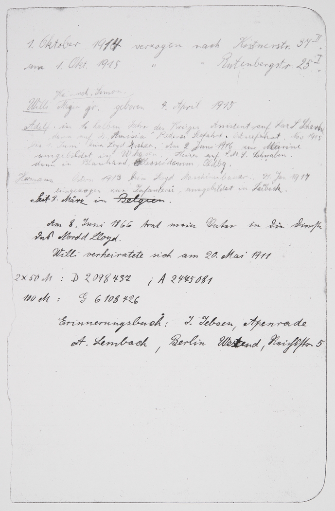 <p>[Page 148]</p><p>Copies of pages removed from diary by Friedrich Meier in 1915 1st October 1914 relocated to Kistnerstr. 37 II [the II possibly standing for 2nd floor, or else 2nd district] 1st October 1915 relocated to Rutenbergstr. 25 I</p><p>Willi Heinrich Simon Meyer jr. born 4th April 1915 Adolf: in the first half-year of the war was an assistant on [indecipherable], then on the steamship Amisia, shipping company Seefahrt & Ostseefahrt.</p><p>Nov. 1915 until 1st June at Lloyd as lathe-operator.</p><p>From 2nd June 1916 trained for the navy in Wilhelmshaven. Stoker on HMS Schwaben, then at [indecipherable] in Oldenburg. Hermann:</p><p>Easter 1913 mechanical engineer at Lloyd.</p><p>On 21st Jan. 1917 conscripted into the infantry, trained in Lübeck.</p><p>Since 8th March in Belgium.</p><p>On 8th June 1866 my father began work at Norddeutsche Lloyd.</p><p>Willi married on 20th May 1911.</p><p>2 x 50 M : D 2098437; A 2475081 100 M : G 6108426</p><p>Souvenir album: J. Jebsen, Apenrade A. Lembach, Berlin Westend, [indecipherable street address] No. 5</p>