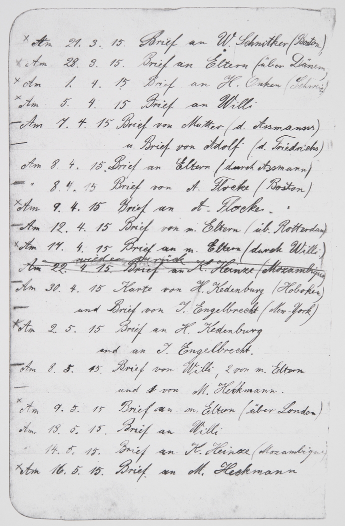 <p>[Page 151]</p><p>On 21st/3/15 Letter to W. Schnitker (Boston)<br />On 28th/3/15 Letter to parents (via Denmark)<br />On 1st/4/15 Letter to H. Onken (Switzerland)<br />On 5th/4/15 Letter to Willi<br />On 7th/4/15 Letter from Mother (through the Assmanns) and letter from Adolf (through the Friedrichs)<br />On 8th/4/15 Letter to parents (through Assmann)<br />On 8th/4/15 Letter from A. Flocke (Boston)<br />On 9th/4/15 Letter to A. Flocke<br />On 12th/4/15 Letter from my parents (via Rotterdam)<br />On 17th/4/15 Letter to my parents (through Willi)<br />On 22nd/4/15 Letter to K. Heinze (Mozambique) (ret. to sender)<br />On 30th/4/15 Card from H. Kedenburg (Hoboken) and letter from J. Engelbrecht (New York)<br />On 2nd/5/15 Letter to H. Kedenburg and to J. Engelbrecht<br />On 8th/5/15 Letter from Willi, 2 from my parents and 1 from M. Heckmann<br />On 9th/5/15 Letter to my parents (via London)<br />On 13th/5/15 Letter to Willi<br />On 14th/5/15 Letter to K. Heinze (Mozambique)<br />On 16th/5/15 Letter to M. Heckmann</p>