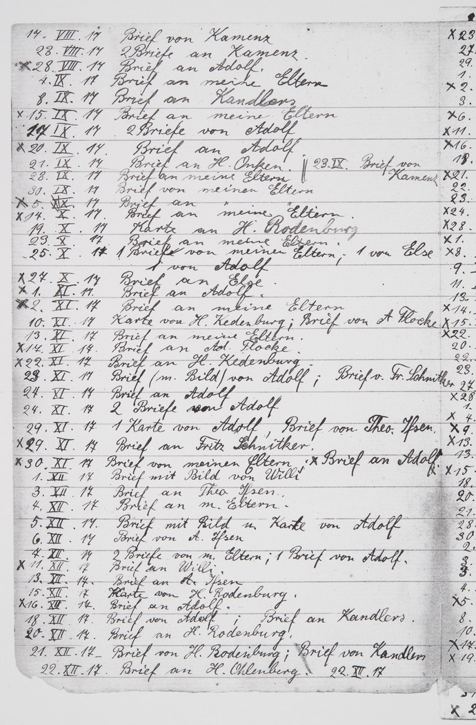 <p>[Page 159]</p><p>17th/8/17 Letter from Kamenz<br />23rd/8/17 2 letters to Kamenz<br />28th/8/17 Letter to Adolf<br />4th/9/17 Letter to my parents<br />8th/9/17 Letter to the Kandlers<br />15th/9/17 Letter to my parents<br />17th/9/17 2 letters from Adolf<br />20th/9/17 Letter to Adolf<br />21st/9/17 Letter to H. Onken // 23rd/9 Letter from Kamenz<br />28th/9/17 Letter to my parents<br />30th/9/17 Letter from my parents<br />5th/10/17 Letter to my parents<br />14th/10/17 Letter to my parents<br />19th/10/17 Card to H. Rodenburg<br />23rd/10/17 Letter to my parents<br />25th/10/17 1 letter from my parents; 1 from Else; 1 from Adolf<br />27th/10/17 Letter to Else<br />1st/11/17 Letter to Adolf<br />2nd/11/17 Letter to my parents<br />10th/11/17 Card from H. Kedenburg; letter from A. Flocke<br />13th/11/17 Letter to my parents<br />17th/11/17 Letter to Ad. Flocke<br />22nd/11/17 Letter to H. Kedenburg<br />23rd/11/17 Letter (w/photo) from Adolf; letter from Fr. Schnitker<br />24th/11/17 Letter to Adolf<br />24th/11/17 2 letters from Adolf<br />29th/11/17 1 card from Adolf; letter from Theo Ifsen<br />29th/11/17 Letter to Fritz Schnitker<br />30th/11/17 Letter from my parents; letter to Adolf<br />1st/12/17 Letter with photo from Willi<br />3rd/12/17 Letter to Theo Ifsen<br />4th/12/17 Letter to my parents<br />5th/12/17 Letter with photo and card from Adolf<br />6th/12/17 Letter from A. Ifsen<br />7th/12/17 2 letters from my parents; 1 letter from Adolf<br />11th/12/17 Letter to Willi<br />13th/12/17 Letter to A. Ifsen<br />15th/12/17 Card from H. Rodenburg<br />16th/12/17 Letter from Adolf<br />18th/12/17 Letter from Adolf; letter to the Kandlers<br />20th/12/17 Letter to H. Rodenburg<br />21st/12/17 Letter to H. Rodenburg; letter from the Kandlers<br />22nd/12/17 Letter to H. Ohlenberg 22nd/12/17</p>