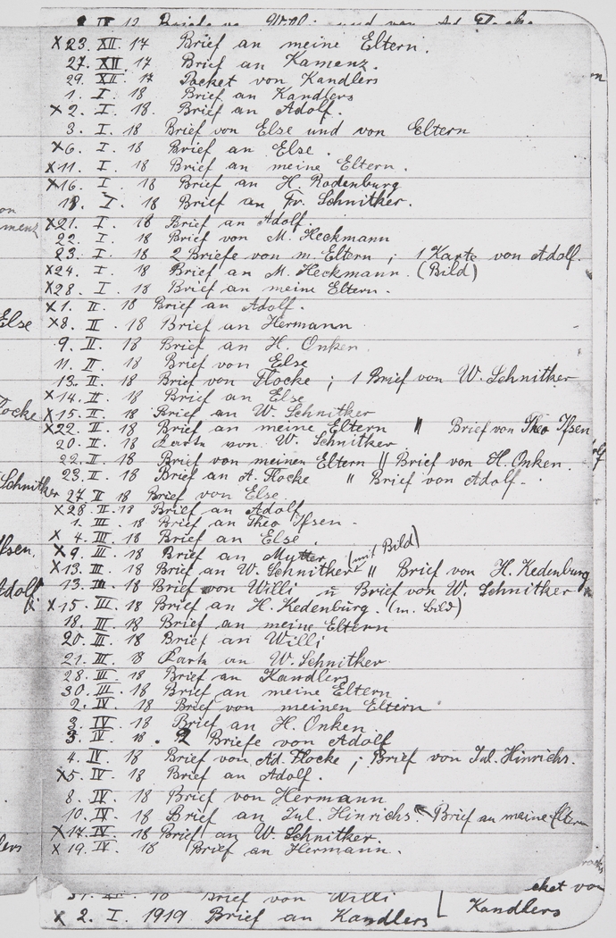 <p>[Page 160]</p><p>23rd/12/17 Letter to my parents<br />27th/12/17 Letter to Kamenz<br />29th/12/17 Parcel from the Kandlers<br />1st/1/18 Letter to the Kandlers<br />2nd/1/18 Letter to Adolf<br />3rd/1/18 Letter from Else and from parents<br />6th/1/18 Letter to Else<br />11th/1/18 Letter to my parents<br />16th/1/18 Letter to H. Rodenburg<br />18th/1/18 Letter to Fr. Schnitker<br />21st/1/18 Letter to Adolf<br />22nd/1/18 Letter from M. Heckmann<br />23rd/1/18 2 letters from my parents; 1 card from Adolf<br />24th/1/18 Letter to M. Heckmann (photo)<br />28th/1/18 Letter to my parents<br />1st/2/18 Letter to Adolf<br />8th/2/18 Letter to Hermann<br />9th/2/18 Letter to H. Onken<br />11th/2/18 Letter from Else<br />13th/2/18 Letter from Flocke; 1 letter from W. Schnitker<br />14th/2/18 Letter to Else<br />15th/2/18 Letter to W. Schnitker<br />22nd/2/18 Letter to my parents // Letter from Theo Ifsen<br />20th/2/18 Card from W. Schnitker<br />22nd/2/18 Letter from my parents // Letter from H. Onken<br />23rd/2/18 Letter to A. Flocke // Letter from Adolf<br />27th/2/18 Letter from Else<br />28th/2/18 Letter to Adolf<br />1st/3/18 Letter to Theo Ifsen<br />4th/3/18 Letter to Else<br />9th/3/18 Letter to Mother<br />13th/3/18 Letter to W. Schnitker (with photo) // Letter from H. Kedenburg<br />13th/3/18 Letter from Willi and letter from W. Schnitker<br />15th/3/18 Letter to H. Kedenburg (w/photo)<br />18th/3/18 Letter to my parents<br />20th/3/18 Letter to Willi<br />21st/3/18 Card to W. Schnitker<br />28th/3/18 Letter to the Kandlers<br />30th/3/18 Letter to my parents<br />2nd/4/18 Letter from my parents<br />3rd/4/18 Letter to H. Onken<br />3rd/4/18 2 letters from Adolf<br />4th/4/18 Letter from Ad. Flocke; letter from Jul. Hinrichs<br />5th/4/18 Letter to Adolf<br />8th/4/18 Letter from Hermann<br />10th/4/18 Letter to Jul. Hinrichs Letter to my parents<br />17th/4/18 Letter to W. Schnitker<br />19th/4/18 Letter from Hermann</p>