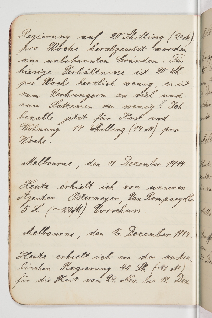 <p>[Page 17]</p><p>our pay has been cut to 20 shillings (20 M) per week by the government. Given local prices, 20sh a week is rather pitiful; it's too much to die and too little to live. I now pay 17 shillings (17 M) a week for board and lodging.</p><p>Melbourne, December 11, 1914. Today I received an advance of £5 (about 100 M) from our agent Ostermeyer at Van Rompaey & Co. </p><p>Melbourne, December 16, 1914. Today I received 40sh (about 40 M) from the Aust. government for the period from 29th Nov to 12th Dec.</p>
