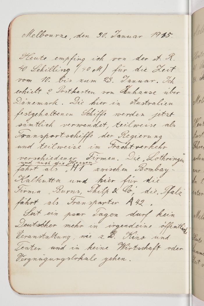<p>[Page 19]</p><p>Melbourne, January 30, 1915. Today I received 40 shillings (40 M) from the A. g. for the period from 10th to 23rd January. I received 2 postcards from home via Denmark. All the ships detained here in Australia are now being used, either as transporters for the government or as freighters for various companies. The Lothringen (as well as the Hessen) runs as H1 between Bombay- Calcutta and here for Burns, Philp & Co; the Pfalz runs as transporter A42. Since a few days ago, Germans are no longer allowed at any public event, be it the cinema, the theatre, a pub or a dance hall.</p>