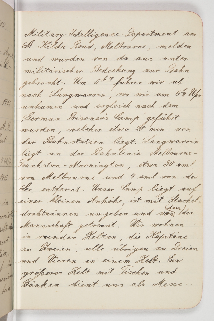 <p>[Page 22]</p><p>Military Intelligence Department in St Kilda Road, Melbourne, and where then escorted to the train station by military guards. We departed for Langwarrin at 5.19, where we arrived at 6.30 and were immediately brought to the German Prisoner's Camp, which is about 20 min from the train station. Langwarrin is on the Melbourne-Frankston-Mornington rail line, about 30 sea miles from Melbourne and 4 sea miles from the ocean. Our camp is situated on a small hill, fenced in by barbed wire and separated from the crews camp. We live in round tents, the captains in twos, all others in threes or fours. A larger tent with tables and benches serves as our mess.</p>