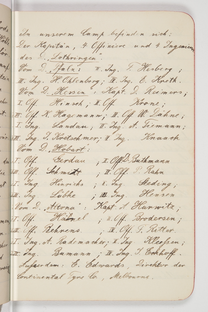 <p>[Page 28]</p><p>In our camp there are: The captain, 4 officers and 4 engineers from the S. [steamship] Lothringen.</p><p>From the S. Pfalz: 2nd engineer F. Hesberg; 3rd engineer H. Ohlenberg; 4th engineer E. Kreth.</p><p>From the S. Hessen: Capt. D. Reimers; 1st mate Hinsch; 2nd mate Krone; 3rd mate K. Hagemann; 4th mate W. Dähne; 1st engineer Landau; 2nd engineer A. Tiemann; 3rd engineer J. Kretschmer; 4th engineer Knaack.</p><p>From the S.Hobart: 1st mate Gerdau; 2nd mate D. Buthmann; 3rd mate Schmidt; 4th mate P. Rahn; 1st engineer Hinrichs; 2nd engineer Steding; 3rd engineer Lübke; 4th engineer Hensen.</p><p>From the S.Altona: Capt. A. Hurwitz; 1st mate Hähnel; 2nd mate Brodersen; 3rd mate Behrens; 4th mate F. Ritter. 1st engineer A. Rademacher; 2nd engineer Kleessen; 3rd engineer Bumann; 4th engineer J. Eckhoff. Further: E. Edwards, Director of Continental Tyre Co., Melbourne.</p>