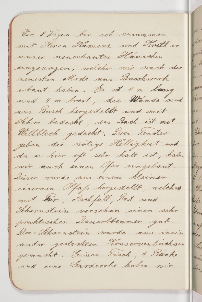 <p>[Page 37]</p><p>Eight days ago, I, along with Mr Kamenz and Kreth, moved into our newly built cabin, built in the latest fashion from bushes. It is 4m long and 4m wide, the walls are made from bush and covered with mud, the roof is covered with corrugated iron. Three windows provide the necessary light and because it is often so cold here, we have also installed a stove. It was made from a small iron oil barrel, and by adding a door, ash drop, grid and flue we got ourselves a very handy heater. The flue was fashioned from tins that were fitted together. We made a table, 4 benches and a dresser</p>