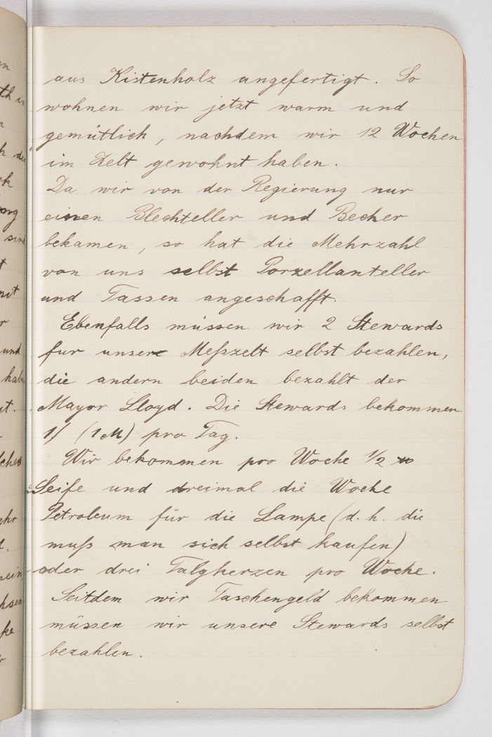 <p>[Page 38]</p><p>from crates. Thus we are now living cosily and in comfort, after roughing it out in tents for 12 weeks. Since the government provided us with only a tin plate and tin cup, most of us have bought some chinaware. We have to pay for 2 stewards in the mess tent, the other two are paid by Major Lloyd. The stewards get 1 shilling (1 M) a day. We are given &nbsp;&frac12; oz of soap a week and three times a week some petroleum for the lamp (which we had to buy ourselves] or three tallow candles per week. Since we&#39;re getting pocket money, we have to pay our stewards ourselves.</p>
