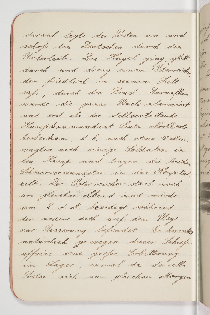 <p>[Page 43]</p><p>the guard took aim and shot the German in the lower abdomen. The bullet went clean through and hit an Austrian, who was sitting peacefully in his tent, in the chest. Right away all the guards were alerted but it was only when the deputy camp commander, Lt. Northcote, arrived on the spot that some soldiers dared to come into the compound, i.e. after about 10 minutes, to carry off the wounded to the hospital tent. The Austrian died that same evening and was buried on the 2nd of the month, while the other is recovering slowly. Of course, there was enormous outrage in the camp over this shooting affair, all the more so because that same guard apparently</p>