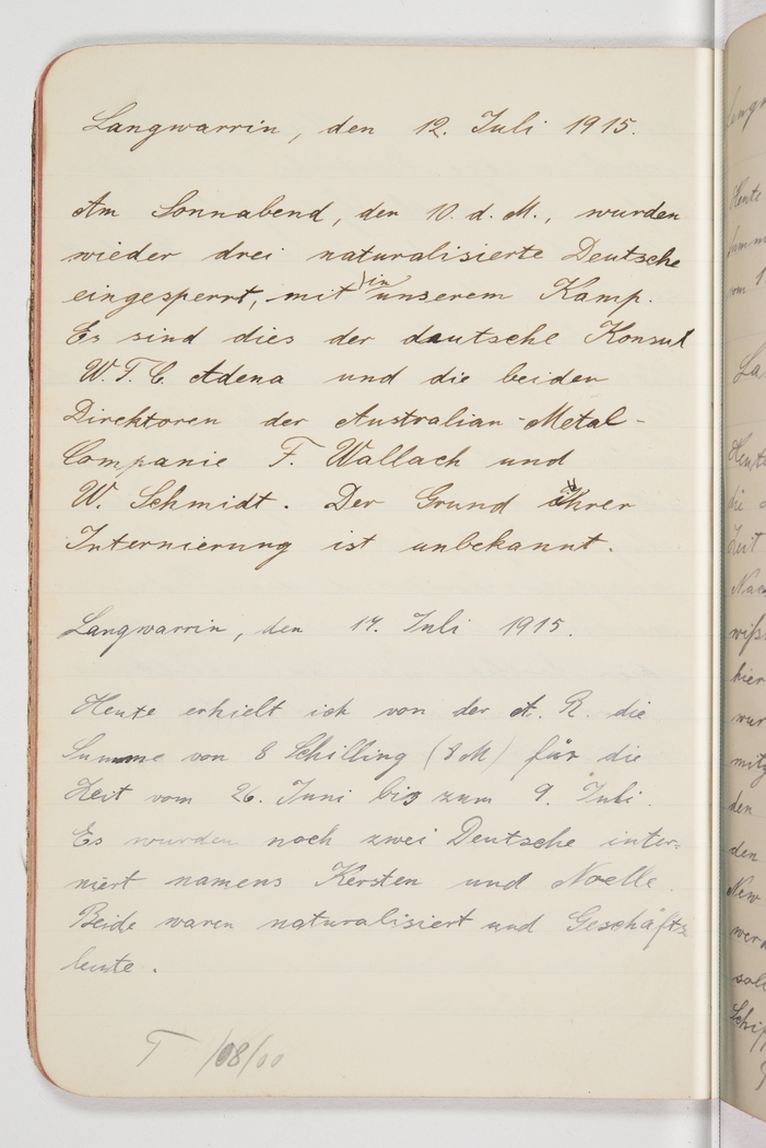 <p>[Page 45]</p><p>Langwarrin, July 12, 1915. On Saturday, the 10th, another three naturalised Germans were interned in our camp. They are the German consul W.F.C. Adena and the two directors of the Australian Metal Companie F. Wallach and W. Schmidt. The reason for their internment is not known.</p><p>Langwarrin, July 17, 1915. Today I received the sum of 8 shillings (8 M) from the A. g. for the period 26th June to 9th July. Two more German were interned, named Kersten and Noelle. Both were naturalised and business people.</p><p>[Note in Margin] T /08/00</p>