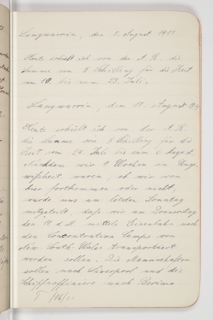 <p>[Page 46]</p><p>Langwarrin, August 5, 1915 Today I received the sum of 8 shillings from the A. g. for the period 10th to 23rd July.</p><p>Langwarrin, August 17, 1915 Today I received the sum of 8 shillings from the A. g. for the period 24th July to 6th August. After having been suspended in uncertainty for 7 weeks about whether we would be leaving here, we were told last Sunday that on Thursday the 19th we would be transported via railway to the two NSW concentration camps. The crews to Liverpool and the ship officers to Berima [Berrima].</p><p>[Note in Margin: T /16/00]</p>