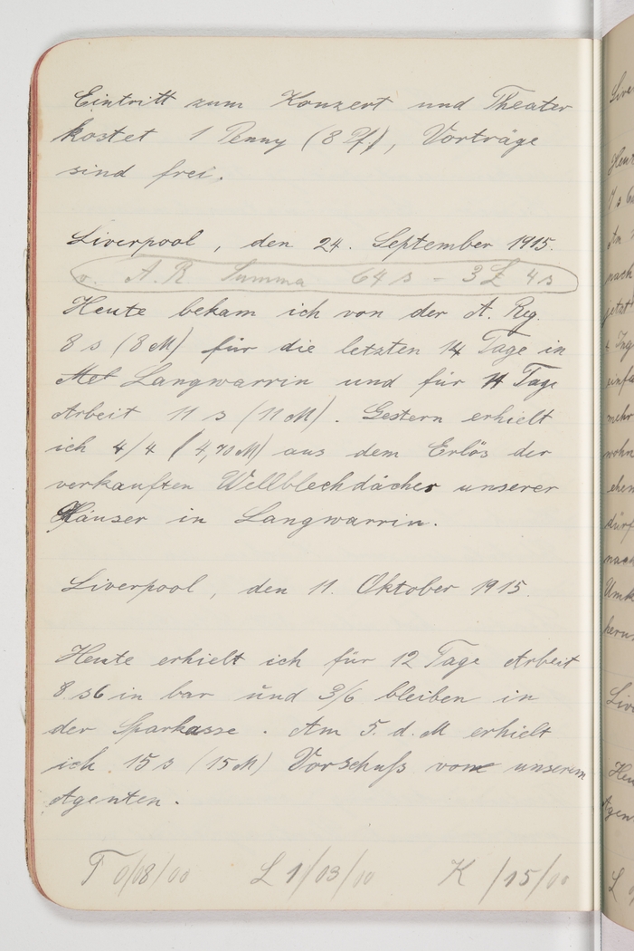 <p>[Page 55]</p><p>Admission to plays and concerts is 1 penny (8 Pf), lectures are free.</p><p>Liverpool, September 24, 1915. (From A. g. [Australian government] total of 64s = £3 4s) Today I received 8s (8 M) from the A. g. for the last 14 days in Mel Langwarrin and 11s (11 M) for 11 days of work. Yesterday I received 4/4 (4.70 M) from the proceeds of selling the corrugated-iron roofs of our houses in Langwarrin.</p><p>Liverpool, October 11, 1915. Today I received 8s 6d in cash for 12 days work; the balance of 3/6 remains in the savings account. On the 5th of this month I received an advance of 15s (15 M) from our agent.</p><p>[Note in Margins] T 0/18/00 L 1/03/00 [L = Lohn/Lãhnung = salary] K /15/00</p>
