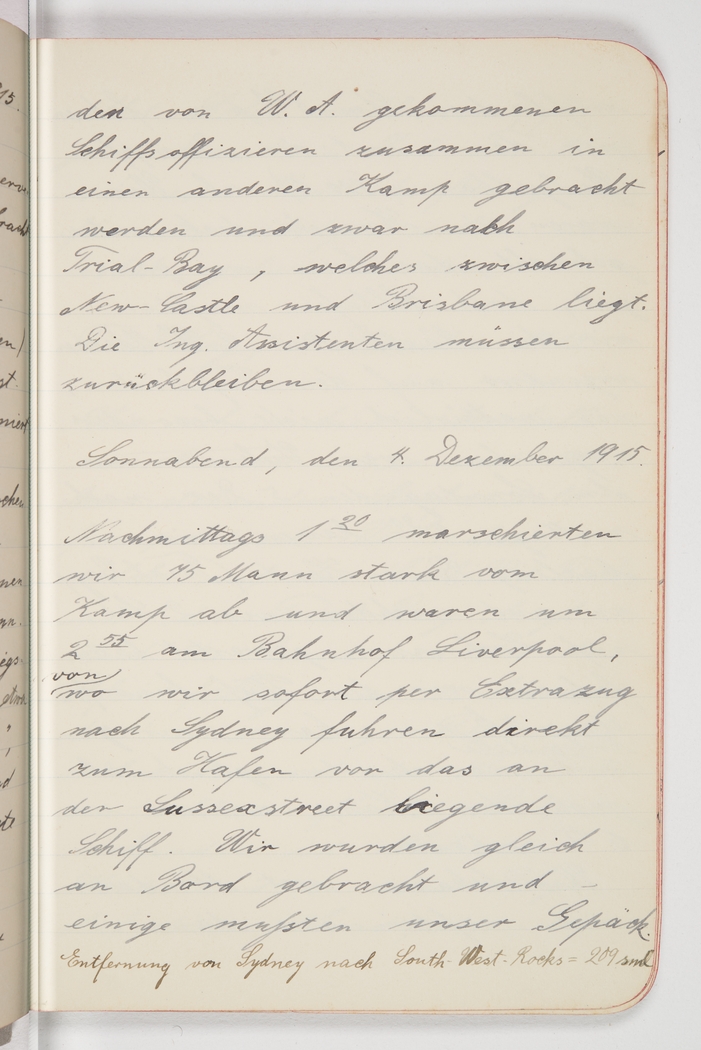 <p>[Page 58]</p><p>that came from WA, are to be brought to another camp, to Trial Bay, which is located between New-Castle and Brisbane. The engineer's assistants have to remain here.</p><p>Saturday, December 4, 1915. At 1.30pm, 75 of us departed from the camp and arrived at Liverpool train station at 2.55pm, where we immediately left on a special train for Sydney, right to the harbour, to the ship that was anchored at Sussex St. We were immediately brought aboard while some had to load</p><p>[Note in Margin] Distance from Sydney to South West Rocks = 209sml [sea miles]</p>