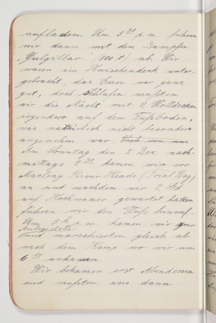 <p>[Page 59]</p><p>our luggage. At 5.30pm we departed on the steamship Yulgilbar (800 tonnes). We travelled steerage, the food was OK, but we had to sleep on the bare floor with just 2 blankets, which was not very comfortable of course. <s>Many of us</s></p><p>On Sunday, Dec. 5, at 2.30pm we arrived at Macleay River Heads (Trial Bay) and after waiting for the high tide for 2 hours, we continued up the river. At 5pm we arrived at the jetty and right away marched off to the camp, where we arrived at 6.15pm. We first ate dinner and then had to</p>