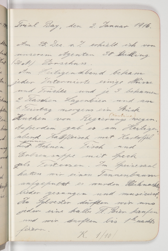 <p>[Page 64]</p><p>Trial Bay, January 2, 1916. On the 25th of Dec. I received an advance of 30 shillings (30 M) from our agent. On Christmas Eve, courtesy of the government (canteen), each internee was given a few nuts and fruit, and every 3 men got 2 bottles of lager beer, and on Christmas Day each got a piece of cake. Also, on Christmas Eve we were served a special dinner of veal with potatoes and green beans, fish and pea soup with bacon. We had put up a Christmas tree in the canteen and we sang and played Christmas carols. On New Year&#39;s Eve we were allowed to buy half a bottle of beer each and to stay up until 1am.</p><p>[In margin]&nbsp; &nbsp;K. 1/10/&nbsp;</p>