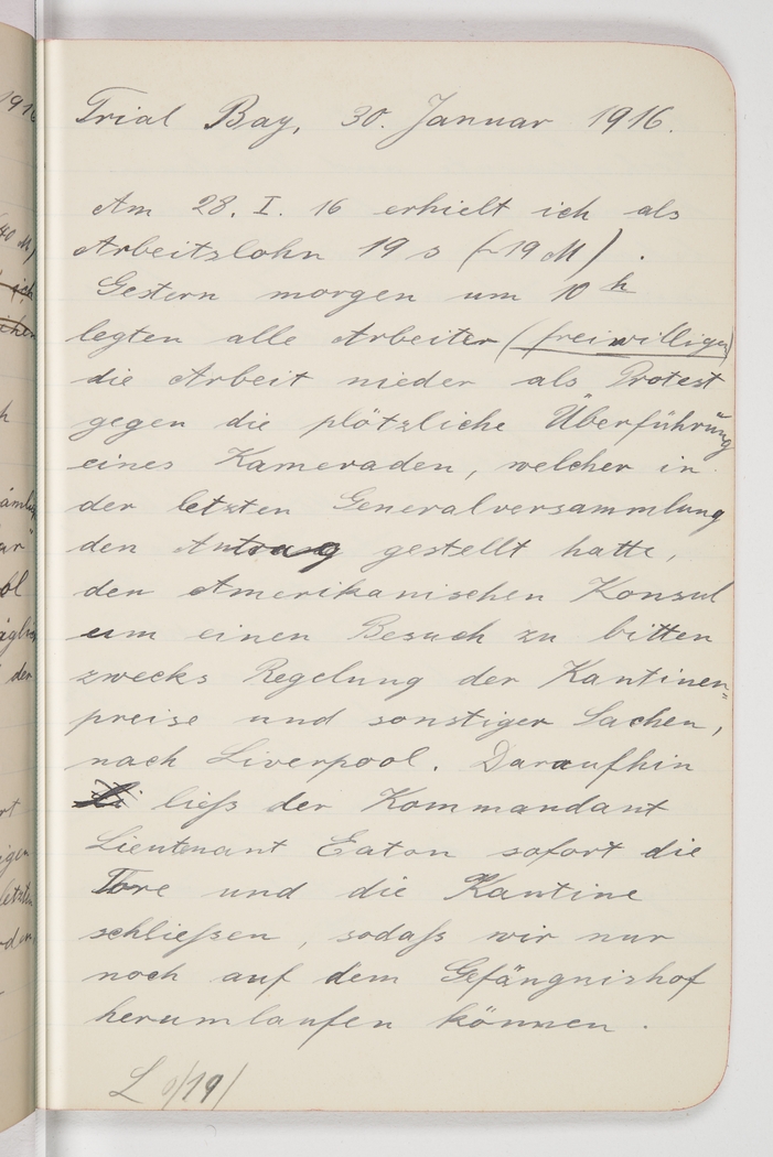 <p>[Page 66]</p><p>Trial Bay, January 30, 1916. On 28th/1/16 I received pay of 19s (about 19 M) for work done. Yesterday at 10am, all (voluntary) workers went on strike to protest against the sudden transfer to Liverpool of a comrade who, at the last general assembly, had moved that the American consul be asked to visit in order to settle a few matters, among them the prices at the canteen. As a consequence [of the strike] the commander, Lieutenant Eaton, immediately had the gates and the canteen locked so that now we can only move about in the courtyard.</p><p>[Note in Margin] L 0/19</p>
