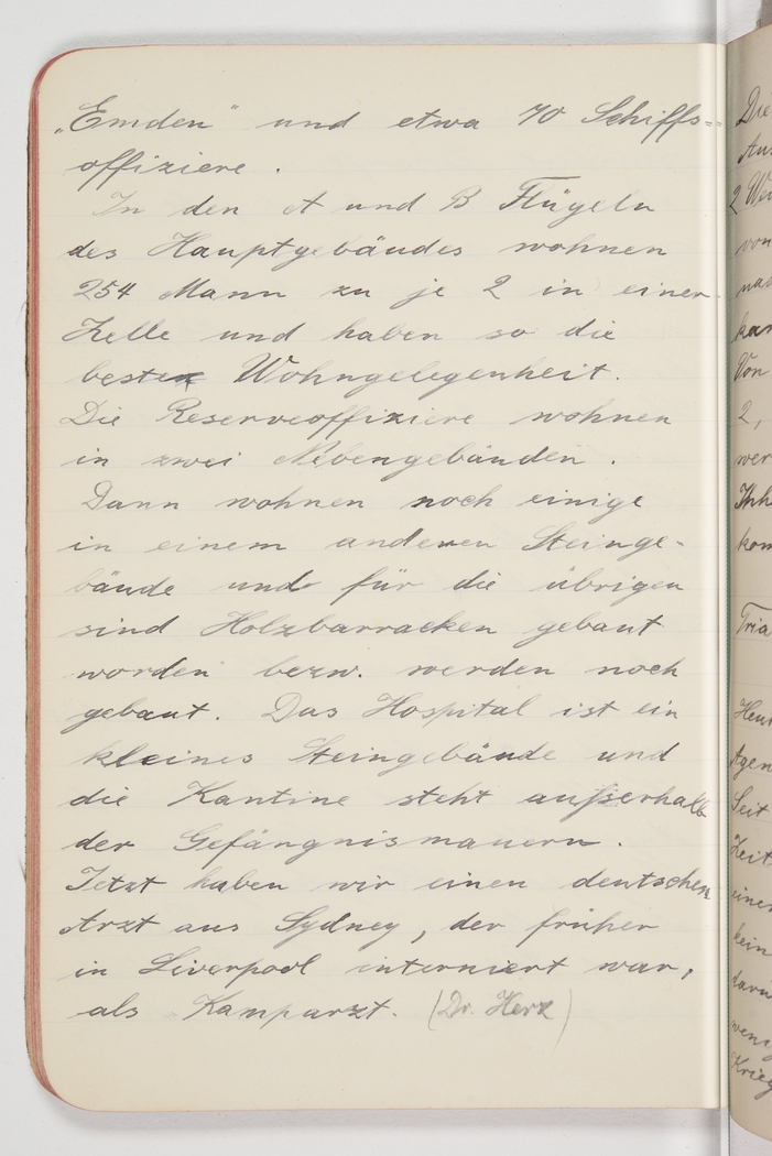 <p>[Page 73]</p><p>Emden&nbsp;and about 70 ship&#39;s officers. The wings A and B of the main building accommodate 254 men, 2 per cell, who really have the best deal. The reserve officers live in two peripheral buildings. Then there are a few who live in yet another stone building and for the others they have built wood barracks, or are still building them. The hospital is in a smaller stone building and the canteen is located outside the gaol walls. We now have a German doctor from Sydney, who used to be interned in Liverpool, as our camp doctor. (Dr. Herz)</p>
