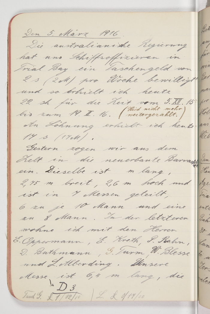 <p>[Page 75]</p><p>5th of March, 1916. The Australian government has granted us ship's officers in Trial Bay 2s (2 M) a week in pocket money and thus I received 22s today for the period from 5/12/15 to 19/2/16. (Will no longer be paid.) As for salary, I received 17s (17 M) today. Yesterday we moved from the tent into the newly built barrack. It is .. [figure missing] m long, 2.75m wide, 2.6m high and divided in 7 units, 6 of them for 10 men each and one for 8 men. In the latter I live with Messrs E. Oppermann, E. Kreth, P. Bahn, D. Buthmann, G. Turm, W. Blesse and L. Alberding. Our unit (D3) is 6.4m long, the</p><p>[Note in Margin] Tusch G. £1/02/00 / L. £0/17/00</p>