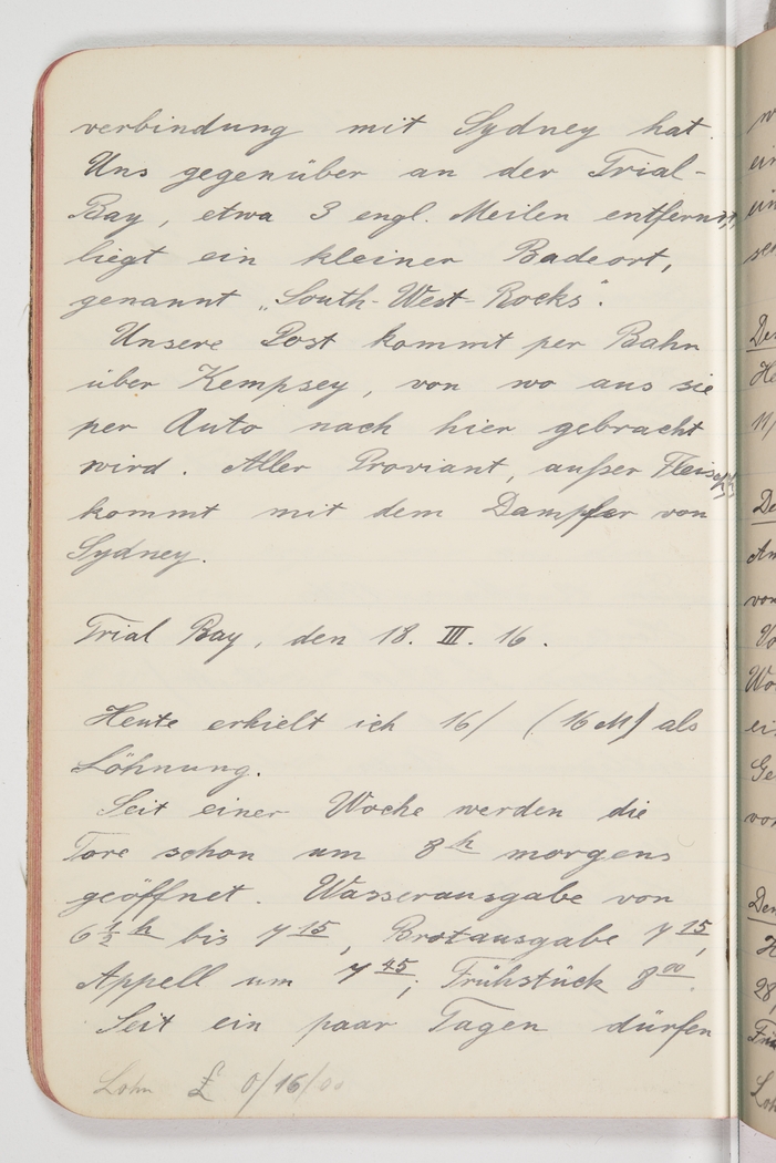 <p>[Page 77]</p><p>arrives from Sydney. Facing us at Trial Bay, about 3 English miles away, is a small resort called South West Rocks. Our mail arrives per train via Kempsey, from where it is brought here by car. All foodstuffs bar meat come via steamship from Sydney.</p><p>Trial Bay, 18th/3/16. Today I received a salary of 16s (16 M). For a few weeks now, the gates have been opened already at 8am. Water distribution from 6.30am to 7.15am; bread distribution 7.15am; roll-call at 7.45am; breakfast 8am. Since a few days ago</p><p>[Note in Margin] salary &nbsp;&pound;0/16/00</p>
