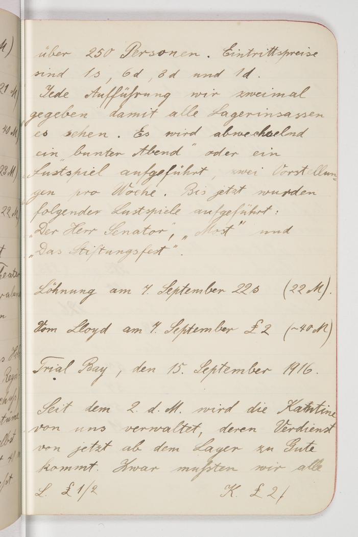<p>[Page 82]</p><p>more than 250 people. Tickets are 1s, 6d, 3d an 1d. Every performance is repeated so that all camp inmates can see it. Variety shows alternate with comedies, two events a week. So far they played the following comedies: Mr Senator, Cider and Foundation Party.</p><p>Salary on 7th of September 22s (22 M).</p><p>From Lloyd on 7th of September £2 (about 40 M)</p><p>Trial Bay, September 15, 1916. Since the 2nd of the month the canteen is being run by us, and all profits go towards the camp. However, we had to take on all</p><p>[Note in Margin] L. £1/2 [company] K. £2/</p>