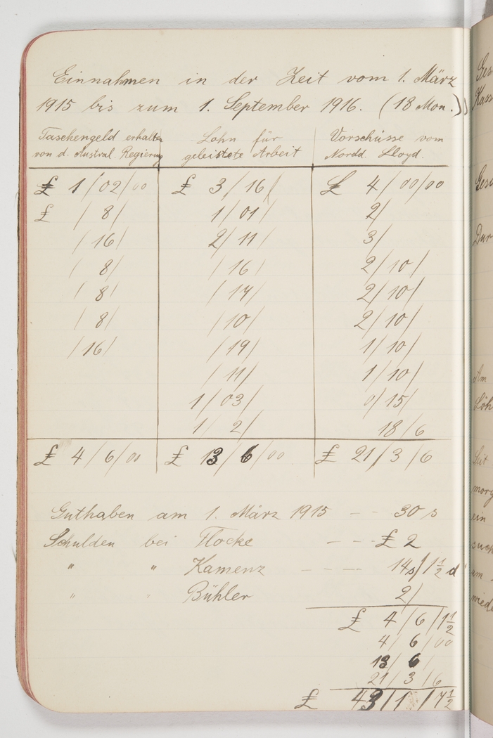 <p>[Page 85]</p><p>Money received in the period from 1st of March 1915 to 1st of September 1916. (18 months)</p><table border="1" cellpadding="1" cellspacing="1" style="width: 500px;"><tbody><tr><td>Pocket money from<br />Aust. Government</td><td>Pay for work done</td><td>Advance from Nordd Lloyd</td></tr><tr><td>£ 1/02/00</td><td>£ 3/16/</td><td>£ 4/00/00</td></tr><tr><td> /8/</td><td> 1/01/</td><td> 2/</td></tr><tr><td> /16/</td><td> 2/11/</td><td> 3/</td></tr><tr><td> /8/</td><td> /16/</td><td> 2/10/</td></tr><tr><td> /8/</td><td> /17/</td><td> 2/10/</td></tr><tr><td> /8/</td><td> /10/</td><td> 2/10/</td></tr><tr><td> /16/</td><td> /19/</td><td> 1/10/</td></tr><tr><td> </td><td> /11/</td><td> 1/10/</td></tr><tr><td> </td><td> 1/03/</td><td> 0/15/</td></tr><tr><td> </td><td> 1/2/</td><td> 18/6</td></tr><tr><td> £ 4/6/00</td><td> £ 13/6/00</td><td> £ 21/3/6</td></tr></tbody></table><p>Credit on 1st of March 1915 30s <br />Owing to Flocke £2<br />Owing to Kamenz 14s/1 ½d <br />Owing to Bühler <u> 2/ </u><br /> £ 4/ 6/1½<br /> 4/ 6/00<br /> 13/ 6/<br /> <u> 21/ 3/6 </u><br /> £ 43/ 1/7 ½</p>