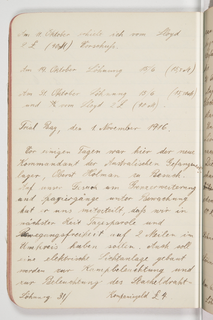 <p>[Page 87]</p><p>On 11th October I received an advance of £2 (40 M) from Lloyd.</p><p>On 19th October salary of 15/6 (15.50 M)</p><p>On 31st October salary of 15/6 (15.50 M) and from Lloyd £2 (40 M).</p><p>Trial Bay, November 1, 1916.<br />A few days ago the new commander of all Australian prison camps, Colonel Holman, visited here. Upon our request for extension of the boundaries and for escorted walks, he informed us that we were shortly to be granted day parole and freedom of movement within a 2-mile radius. They would also install an electricity generator to illuminate the camp and the barbed- wire</p><p>[Note in Margin] salary 31/ company money £4</p>