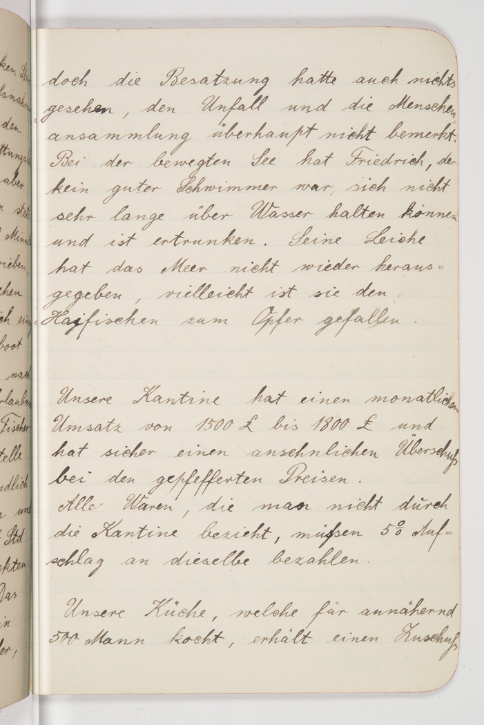 <p>[Page 98]</p><p>but the crew hadn't seen anything, hadn't even noticed the accident and the huge crowd. In the choppy sea, Friedrich, who was not a good swimmer, would not have kept above water for very long and drowned. The sea has never returned his body, so maybe he also fell prey to sharks.</p><p>Our canteen has a monthly turnover of between £1500 and £1800, and given the exorbitant prices, they must make good profits. All goods that are not bought at the canteen attract a surtax of 5% payable to the canteen. Our kitchen, which prepares the food for almost 500 men, receives a subsidy</p>