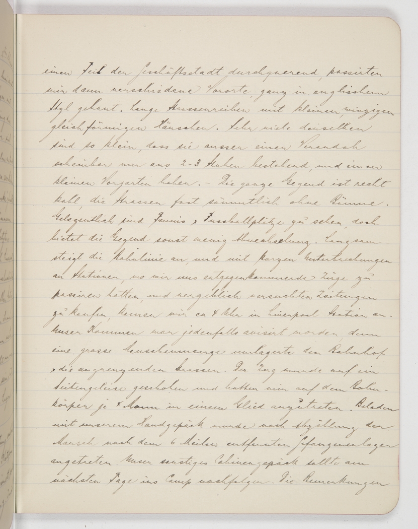 part of the central business district, we moved through various suburbs built in typically English style. Long street blocks with small, minute, uniform houses. A lot of these are so small that apart from a porch they seem to have just 2-3 rooms, and a small backyard. The whole area is rather bleak, the streets almost completely tree-less. Occasionally you see a tennis court or a football field, but on the whole there is very little variety. Gradually the railway track steepens and after stopping briefly at a few stations to let trains from the opposite direction pass, and trying in vain to buy some newspapers, we arrive at Liverpool Station at 4pm. Our arrival must have been pre-advised because throngs of people crowded the station and the adjacent streets.