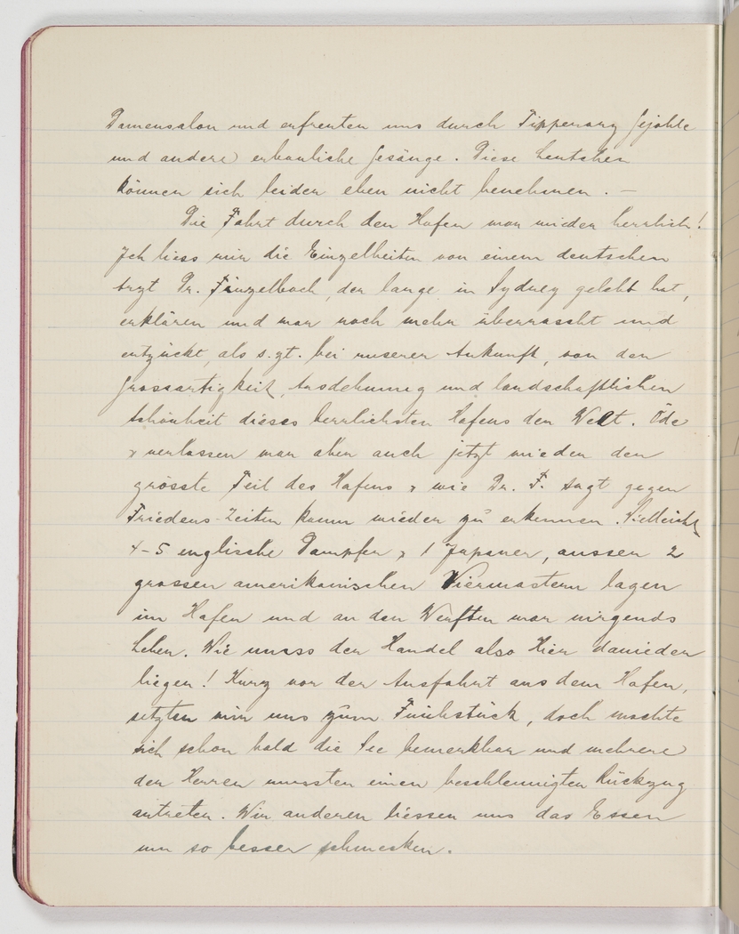 The passage through the harbour again was wonderful! I had a German doctor, Dr Finzelbach, who had lived in Sydney for a long time, explain all the sights to me and was even more taken in and awed than the first time by the magnificence, the size and the beauty of this most wonderful harbour in the world. But again the harbour was eerily quiet and Dr F. said it was hardly recognisable from what it was like before the war. There were maybe 4-5 English steamships and 1 Japanese vessel, but apart from 2 big American schooners there was absolutely no life on the water and at the wharves. How badly commerce must be suffering here! Shortly before crossing the heads breakfast [it seems this should rather be dinner, but he unmistakeably writes breakfast] was served, but the rough sea became soon noticeable and several gentlemen had to take leave rather abruptly. We others dug in all the more eagerly.