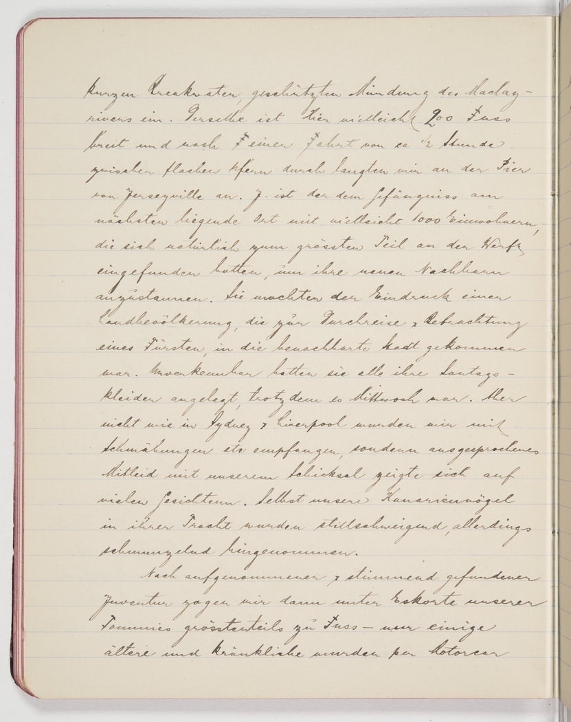 200 feet wide, and after a pleasant trip of about half an hour along shallow banks we arrived at the pier of Jerseyville. J. is the township closest to the prison, of about 1000 inhabitants, which of course had more or less all appeared at the wharf to take a look at their new neighbours. They looked like rural people who had come to gawk at a passing prince. Unmistakeably they were in their Sunday best, even though it was a Wednesday. But unlike Sydney and Liverpool, we were not received with insults, etc; quite on the contrary, empathy with our lot was visible on a many a face. Even our canaries in their costumes were observed silently, if not slightly amused.