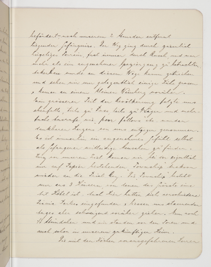 some kind of hotel. Here too various [indecipherable] parties had gathered and watched us with awe but silently pass. Another ¼ hour and we stood in front of the gate and our future home.