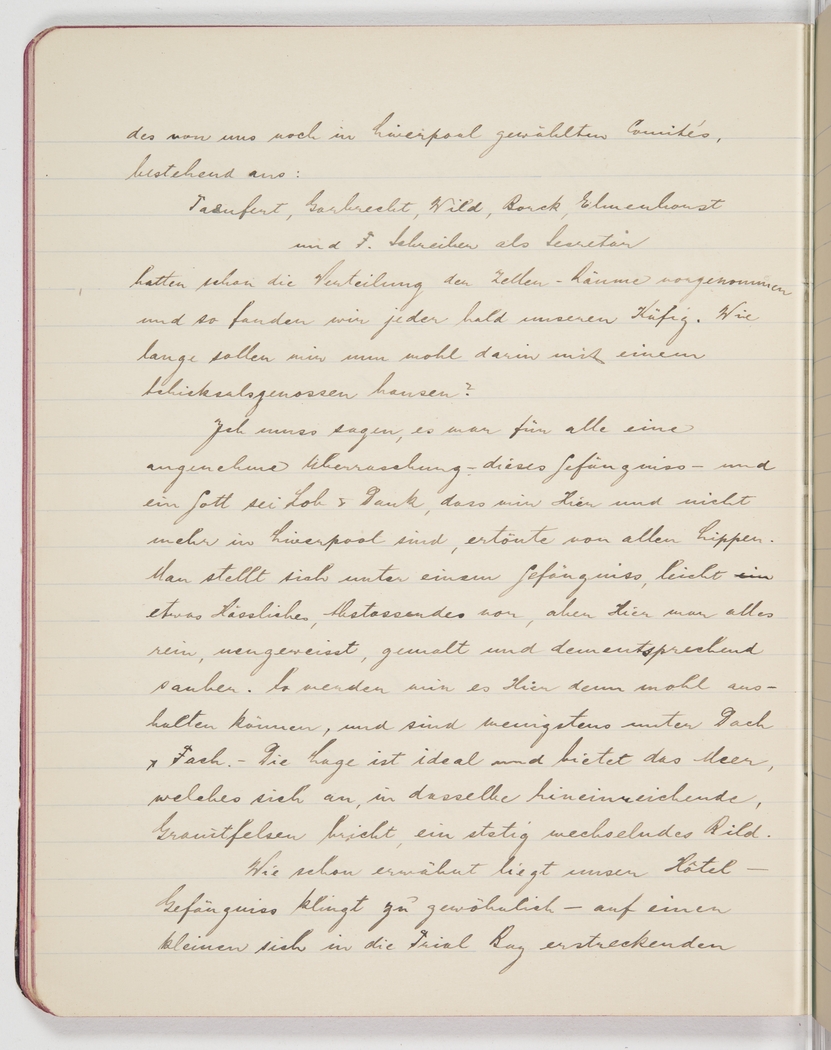 I have to say this prison was a pleasant surprise for all of us, and many a ‘’Thank God, we’re here and no longer in Liverpool’’ escaped our lips. One easily imagines a prison to be something ugly, repulsive, but here everything was clean, freshly whitewashed or painted and accordingly neat. We should be able to bear it and at least we’re safely sheltered. The location is ideal and we can see the sea, watch the surf breaking on the granite rocks that reach into the bay, a constantly changing spectacle.