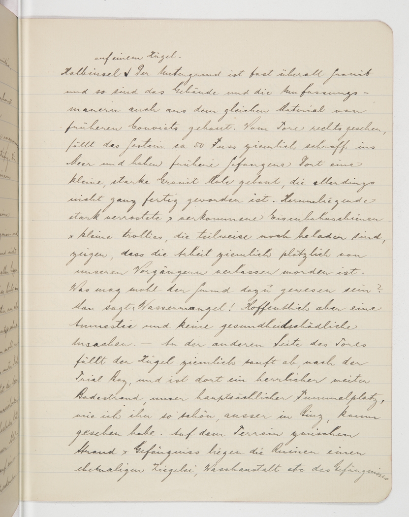 small peninsula that stretches into Trial Bay. The terrain consists for the most part of granite, and former convicts have used the same material to erect the building and the surrounding walls. To the right of the gate, the rock drops sharply into the sea, about 50 feet, and previous prisoners have built a small but strong mole from granite, which however is not quite finished. Scattered rails, badly rusted and dilapidated, as well as small trolleys, some still laden, suggest that our predecessors abandoned their work pretty abruptly. What could have been the reason? They say: lack of water! Let’s hope it was an amnesty and not something detrimental to our health. On the other side of the gate, the hill drops off gently towards Trial Bay, to a beautiful large beach, our main playground; I have hardly seen such a beautiful beach apart from the one in Binz. Between beach and prison lie the ruins of the prison’s former brickworks, laundry, etc
