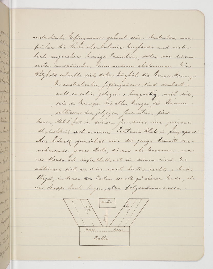 Our “hotel”, in its outline, looks a bit like our Teutonia Club in Singapore. You first enter a big hall, stretching the length of the building, which will serve as our dining room and in the evening as our lounge. Attached to the hall are two wings that house the cells, both on the ground floor and on a second level, something like this: [drawing]