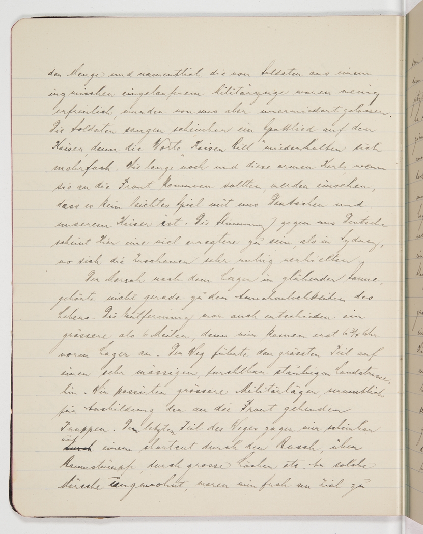 heard from the crowd, and particularly from the soldiers who had disembarked from a military train a short while ago, were not pleasant, but we did not react to them. The soldiers seemed to be singing a satirical song lampooning the Kaiser [the German emperor Wilhelm] because the words ‘’Kaiser Bill’’ were repeated several times. Not long and these poor guys will soon realise, should they get to the front, that they won’t have an easy meal of us Germans and our Kaiser. The mood against us Germans seems to be much more incendiary here than in Sydney, where the spectators kept fairly quiet.