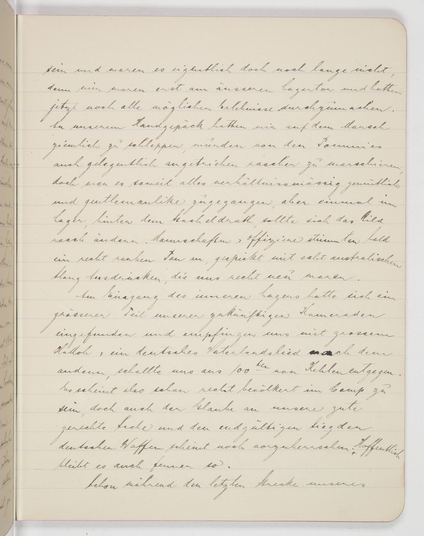 At the gate to the inner camp a large part of our future comrades had assembled and greeted us with a big hello, one German patriotic song after another burst forth from hundreds of throats. The camp seems to be rather populated already, but still the faith in our just cause, and in an ultimate victory of German might, seems unbroken. Hopefully, it will stay that way.
