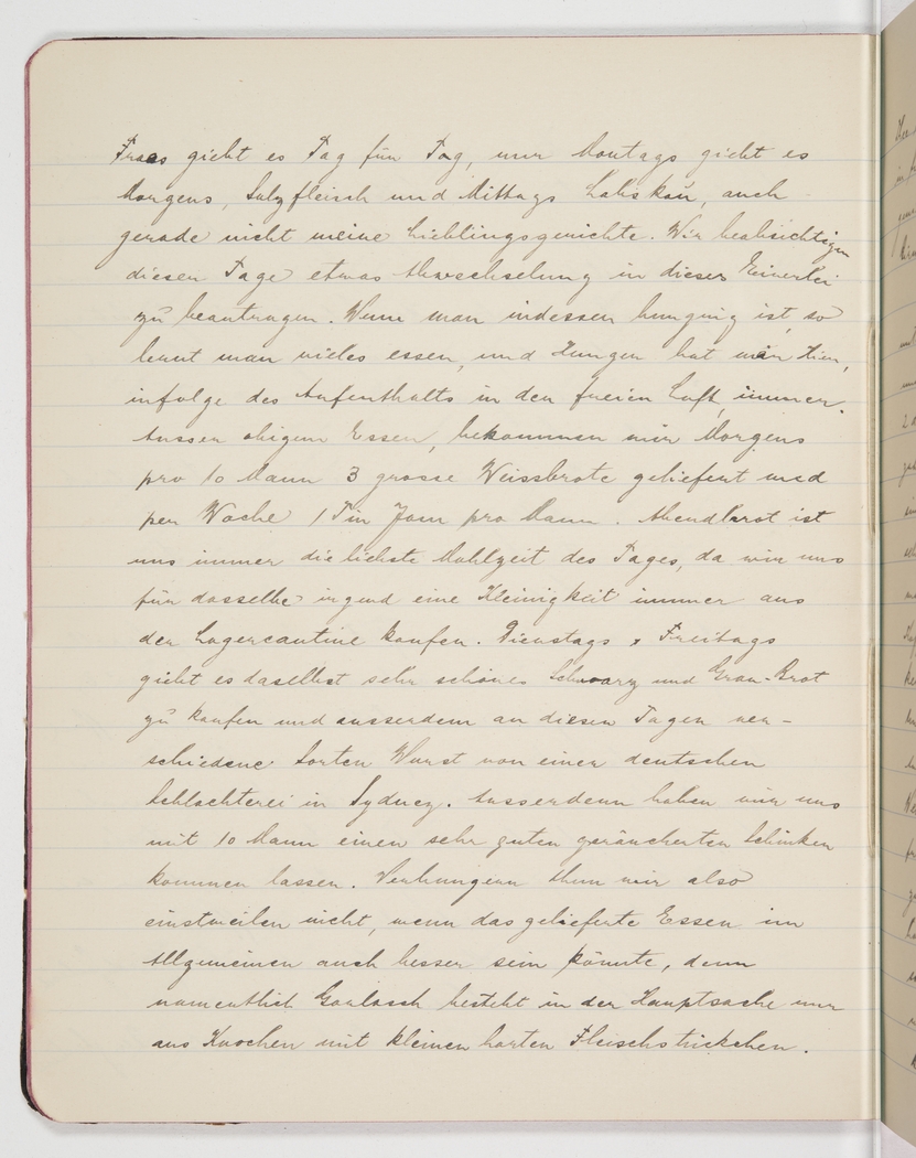 chow day in, day out, except on Mondays we get salt junk in the morning and [indecipherable] for lunch, both not among my favourite dishes. We plan to request some variety to this monotony. However, if you’re hungry, you learn to eat a lot of things, and you’re always hungry due to the open-air existence. Apart from the above-mentioned chow, we also get 3 big loaves of white bread per 10 men in the morning, and 1 Tim Tam per week per man. Tea is always our favourite meal of the day because we always buy some tidbits for it from the camp’s canteen. On Tuesdays and Fridays the canteen offers very nice wholemeal and half white/half wholemeal bread and also various types of sausages from a German slaughterhouse in Sydney. We also had a very nice smoked ham delivered. So for now we’re not starving, but the food the camp provides could generally be better since the stew consists mainly of bones and small, tough pieces of meat.