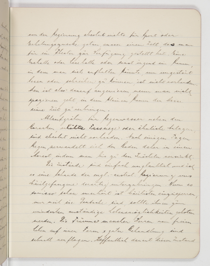 Conditions are just unbelievable and it’s a disgrace how the English-Australian government puts us civilian prisoners up. Apart from the fact that it’s outrageous to arrest civilians just because they are German, at the very least they should be offered decent living conditions. The dreams some men had of living free and comfortably on a farm have fast dissipated. Hopefully this state of affairs