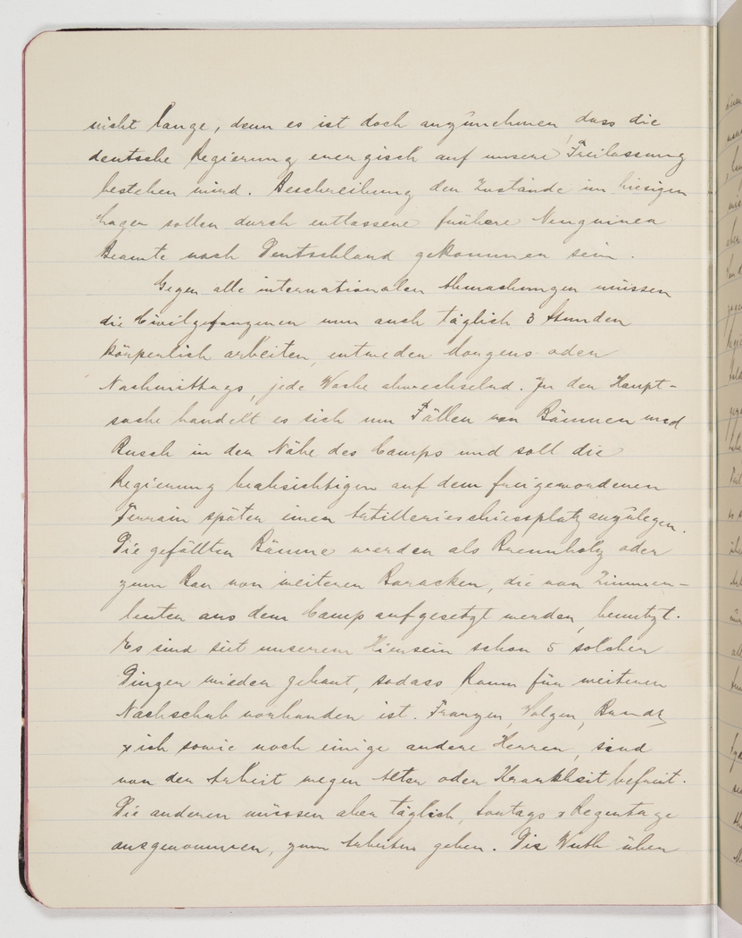 Against all international conventions, civilian prisoners now have to do physical work for 3 hours a day, either in the morning or in the afternoon, alternating from week to week. Mainly this means felling trees and clearing bushland in the vicinity of the camp, where the government plans to erect a shooting range for the artillery. The felled trees are being used for firewood or to erect more barracks, which is done by carpenters within the camp. Since our arrival they have erected 5 more of these things so there is room for further arrivals. Franzen, Volgen, Brandt and I, as well as a few other gentlemen, are exempt from physical work because of age or illness. All others have to go to work daily, except for Sundays and rainy days. There is