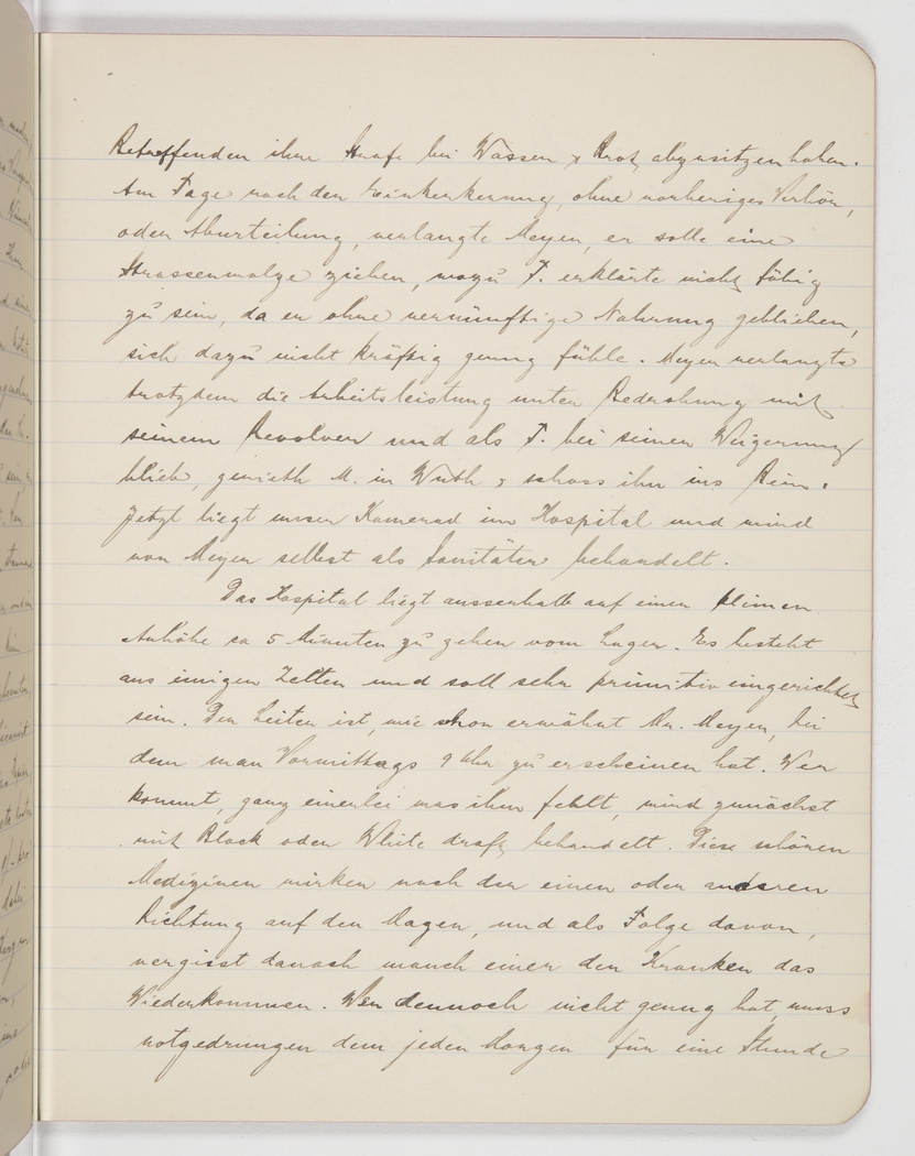 of a few tents and is said to be equipped very poorly. Its supervisor is, as mentioned above, Mr Meyer, before whom one has to appear mornings at 9 o’clock. Regardless of what is ailing you, you’ll be first treated with Black or White draft. These medicines have one or the other effect on your stomach and as a consequence, many a patient forgets to reappear. Those who still haven’t had enough will have to be examined by a doctor who comes every morning for an hour