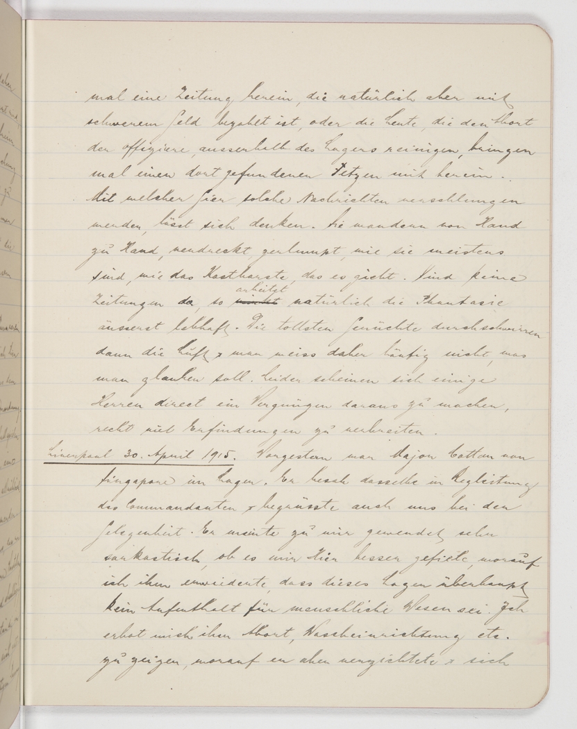 Liverpool, 30th April 1915 The day before yesterday Major Cotton from Singapore was in the camp. He inspected it accompanied by the Commander and greeted us in the process. He asked me, sarcastically, if I liked it better here, to which I replied that this camp was not suitable to house any human being. I offered to show him the lavatories and washing facilities, etc but he declined and