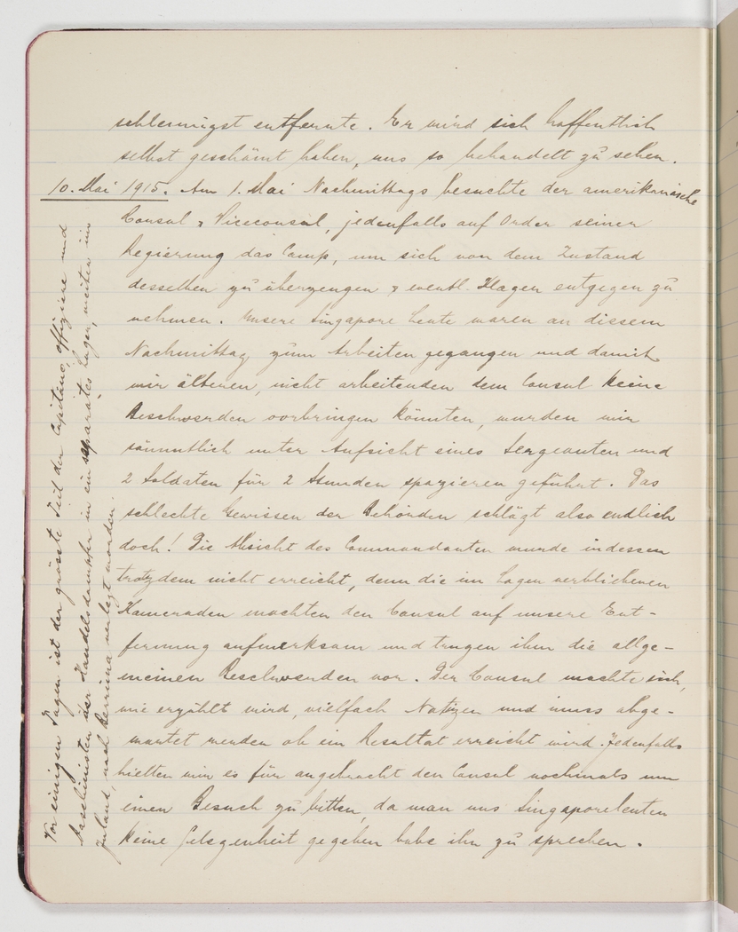 10th May 1915. In the afternoon of the 1st of May, the American consul and vice consul visited the camp, ostensibly on orders from his [their] government, to assess conditions here and possibly listen to complaints. Our Singapore people were away on forced labour this afternoon and to make sure that we older, non-working [people] wouldn’t be able to lodge any complaints with the consul, we were taken on a 2-hour walk by a sergeant and 2 soldiers. So the authorities do have scruples after all! The Commander’s ploy didn’t work, however, because some comrades still left in the camp did manage to tell the consul about our removal and listed the general complaints. They said the consul took lots of notes and we’ll just have to wait and see what comes of it. We Singapore people thought it appropriate to ask for another visit by the consul since we had not been given a chance to talk to him.