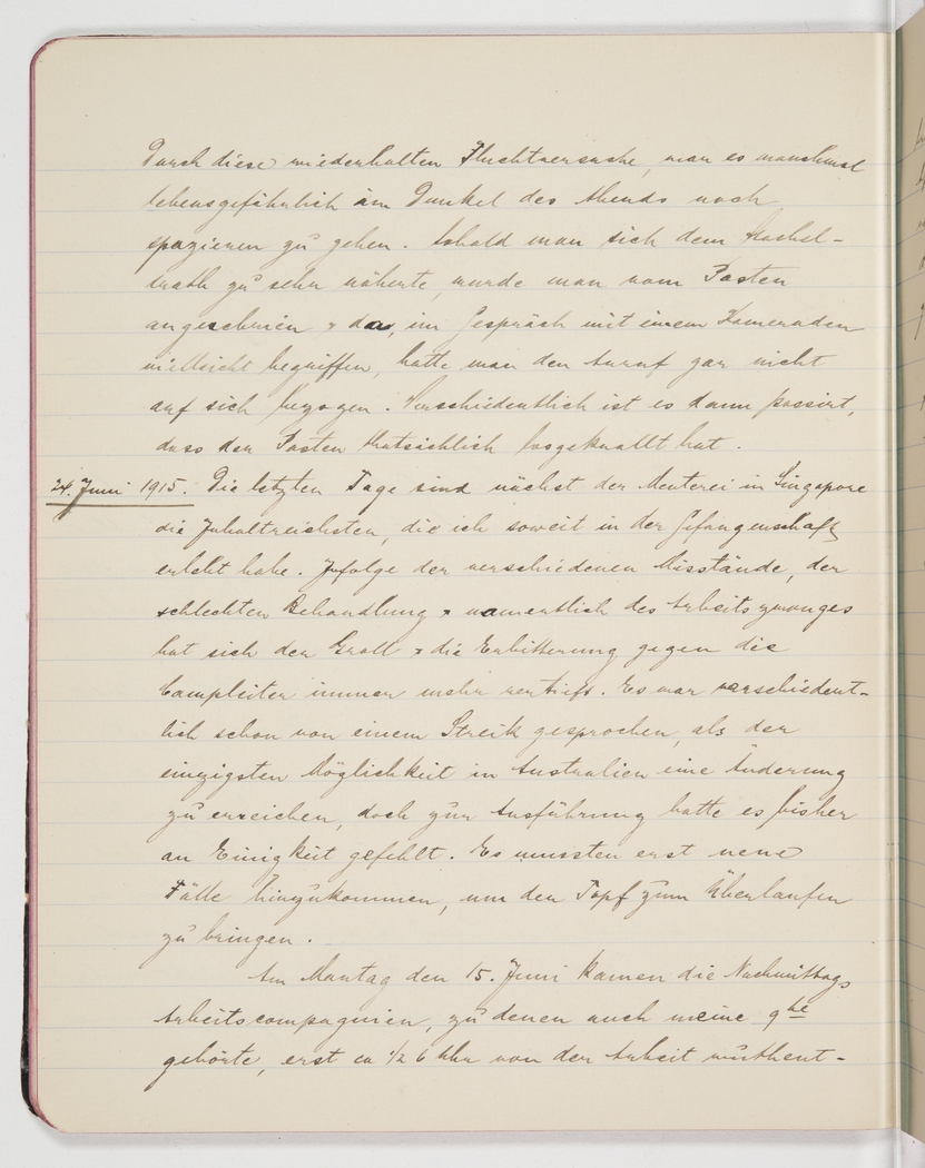 24th June 1915. The last few days were, apart from the rebellion in Singapore, the most eventful so far in my internment. As a result of the deplorable conditions, the bad treatment and, in particular, the forced labour, anger and bitterness towards the camp’s management had been steadily growing. There had been several discussions about a strike as the only possibility in Australia to force about a change, but so far a lack of agreement had prevented action. There had to be some more incidents for the last straw.