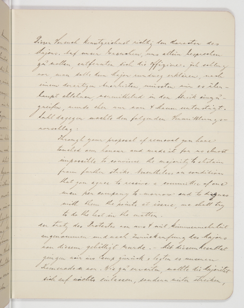 This attempt clearly illustrates the Major’s character. We asked to be left alone in order to consult with each other, and the officers departed. I proposed to tell the Major right away that after such a proposition we would have to refuse to intervene at all in the strike, but I was seconded by only 4 men. Suhl made the following mediation proposal: