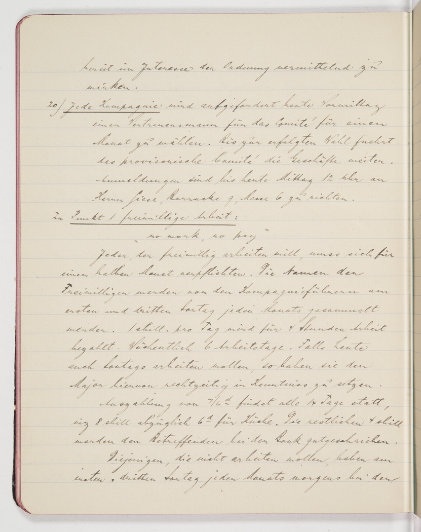 names of the volunteers are to be collected by the company commanders on the first and third Sunday of the month. Pay will be 1 shilling for 4 hours a day. 6 working days weekly. If somebody wants to work on a Sunday, he has to give advance notice to the Major.